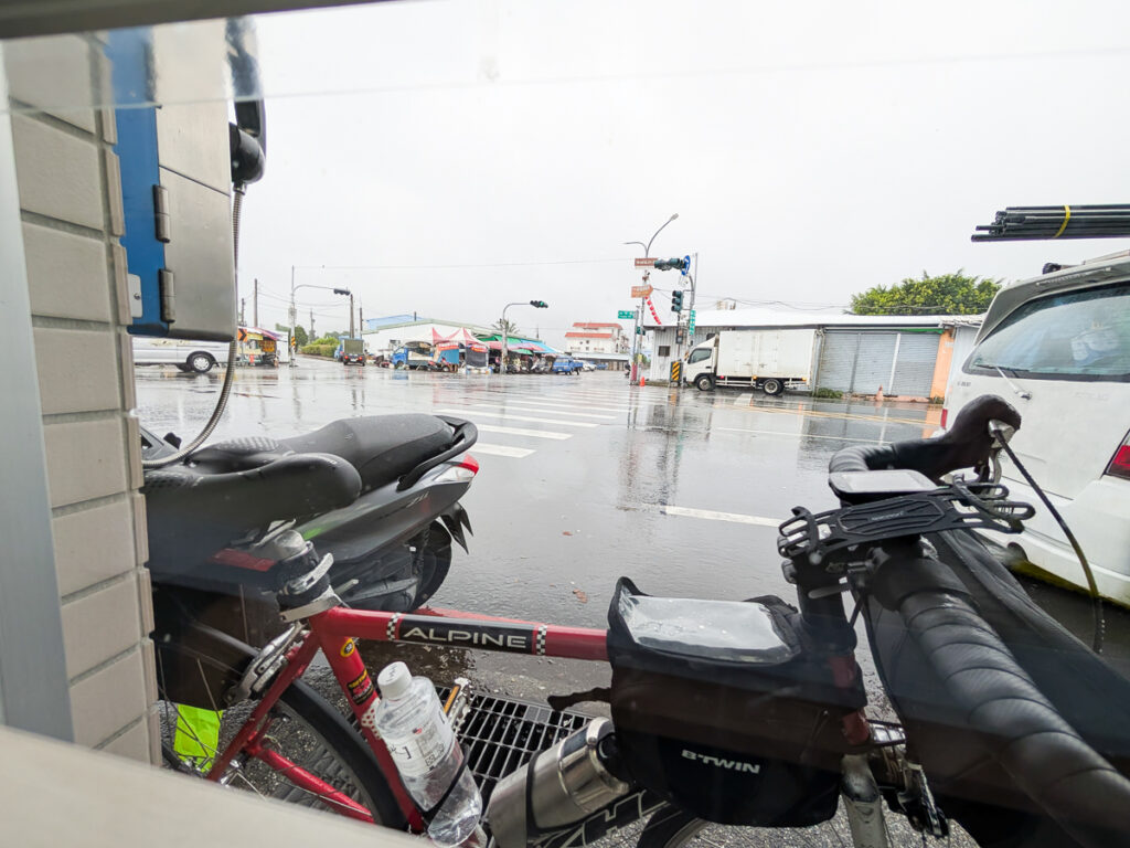 今天的雨幾乎從頭下到尾,一開騎出去雨越下越大,找了一處遮雨棚,把行李的夾鍊袋檢查一下、拖鞋拿出來換上就繼續騎了,還好當初聽了朋友的建議還是把拖鞋帶著。