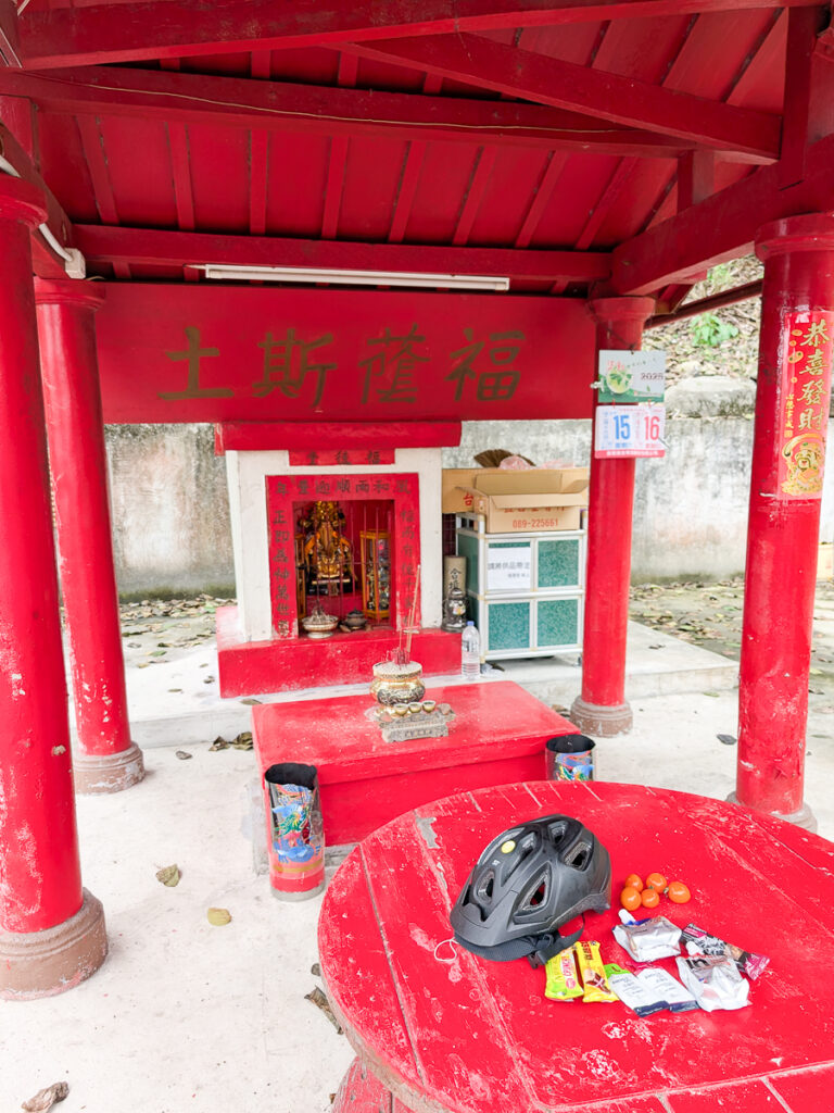 兩隻狗叫個不停,其中一隻還躍過矮牆,真的很怕它來咬我,我就先逃走了,騎去旁邊以前阿嬤每天都會拜的土地公廟。即然都來了,就拜一下吧!身上的補給品充當供品,我拿著香,願一路平安,願阿嬤在天上過得好。