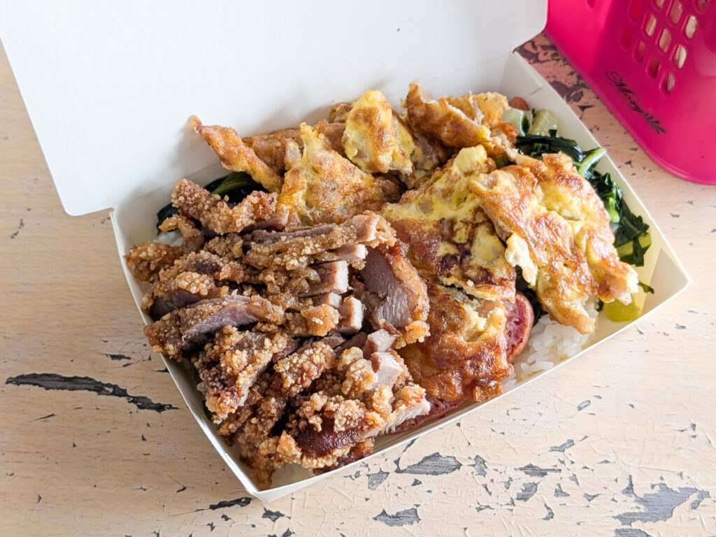 離開士地公廟,收拾東西、也收拾自己的心情,後面經過關山和池上,一定要來個便當的吧?在池上點了個便當,滿到感覺便當盒都快裝不下了。我心滿意足的坐下來享用,一邊和旁邊的爺爺聊天。